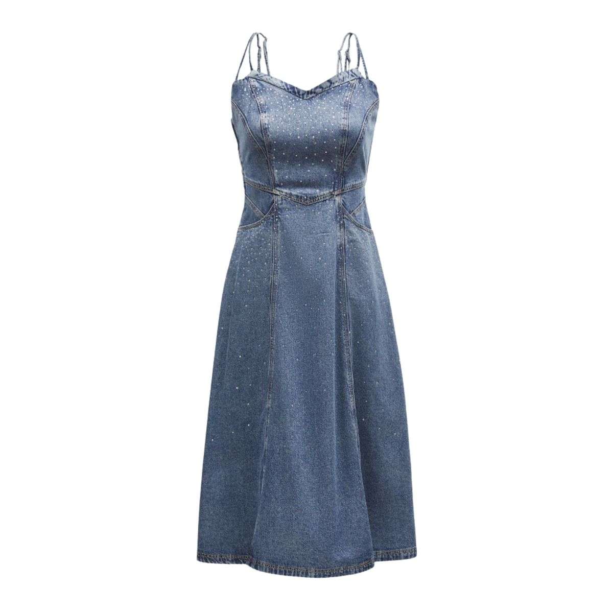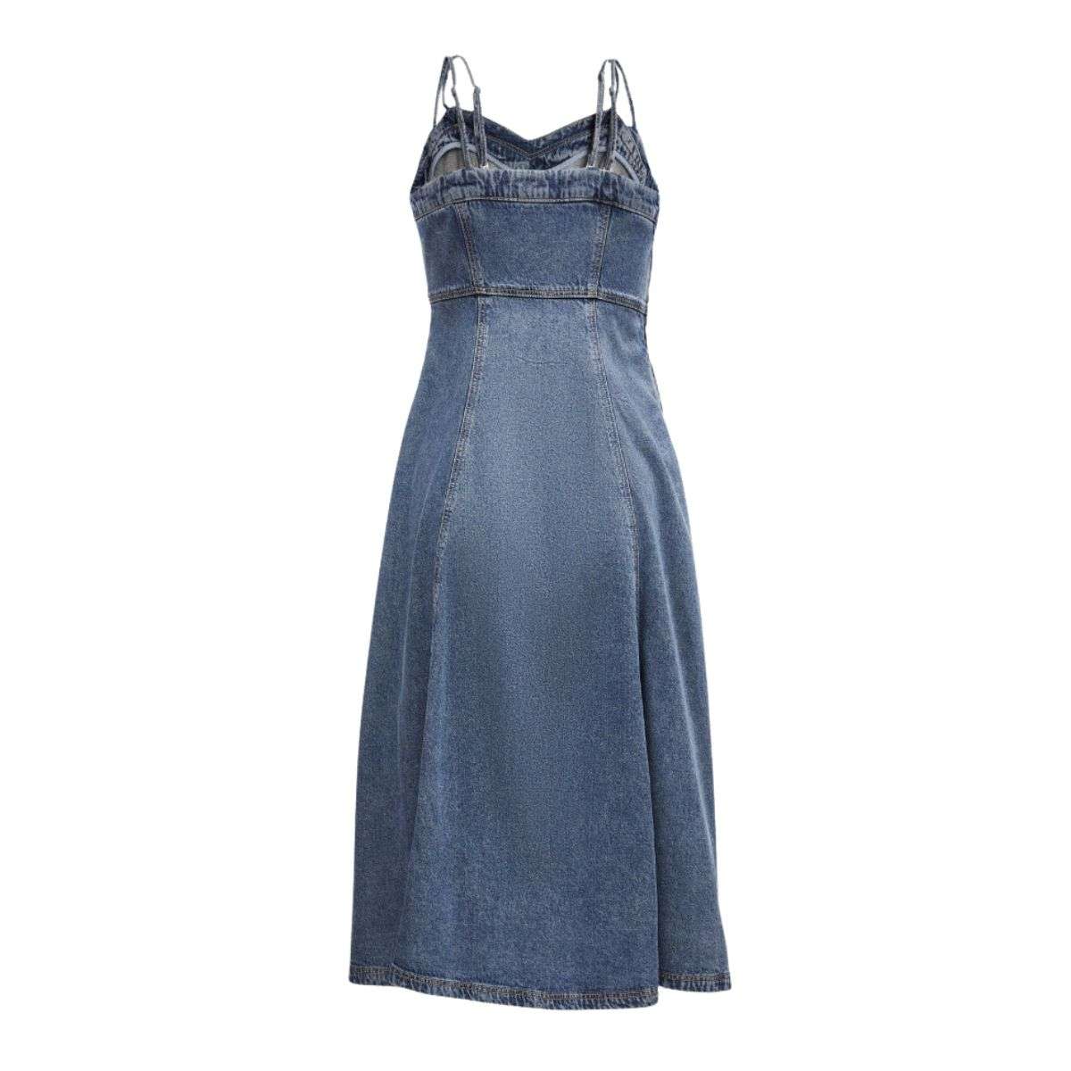 - V-neck spaghetti straps with high-waisted A-line silhouette